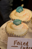 Some had good business sense. Contact information was available via business cards, both on the table or tied to the goods, and stickers on the packaging. One blogger even had the cutest labels I have ever seen: they were little picks that she stuck into the tops of the cupcakes, with the name of the cupcake flavor printed on the label just above a little saying (see right - a little blurry, unfortunately). Very clever. However, many items had fabulous presentations and NO information on the creator. What was worse was that many bloggers were nowhere to be found, so I could not even ask who made it, how they made it, about their blog, etc. Being a successful baker is more than just creating delectable treats; it also demands a good business sense, which, after scoping the scene today, I realize is not innate. However, I believe I have it, and have started to catalog the items I need arm myself for success. I will need a distinguishable logo; pretty, unique packaging; stickers or some sort of identification for the packaging; and business cards, to start. I need to develop a good marketing strategy as well, especially utilizing social media, which means....wahh wahhh... I have to get a Twitter account, something I've avoided since it became popular. Also should probably get over my annoyance with status updates...